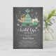 Adorable wild one baby shower invitation featuring a cute forest owl, bear & fox with a green teepee set on a chalkboard background.. Flip our invitation over to view a matching back for an extra special touch.