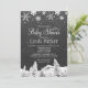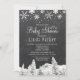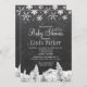Rustic country style baby shower winter chic elegant invitation template with borders of white snowflakes, falling snow and pine trees wonderland landscape on dark grey charcoal chalkboard background. Fill in your information in the spots, You can choose to customise it further changing fonts and colours of lettering. ---- The invitation is suitable for elegant mountains rustic winter / Christmas baby shower parties. --- If you need assistance, please contact me!