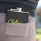 The flask itself is fine. It’s a cheap flask, obviously bought in bulk, however am prepared to overlook that. Given that it is a personalized item, I would have liked to have seen gift boxing instead of the generic packaging. Terrible printing, and/or quality. It’s a cheap, tacky vinyl. It is not cut straight and is also applied in a way that it is overhanging the bottom, causing the glue to catch on items and it will eventually roll and tear, damaging the wrap.