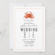 A wedding invitation featuring a watercolor inspired chambray colour design on back. Front features illustration of a crab and faded red pinstripe border. Personalise the grey text.