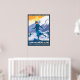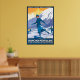 A geat winter sports travel poster for Chamonix Mont Blanc. A woman in blue ice skating outdoors with the mountaions in the background. A Paris, Lyon, Mediterranee advertisement.