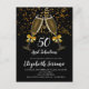 Champagne glasses and gold ribbons with gold confetti on black with white type, 50 and fabulous birthday party invitation. A trendy black invite with a modern script typeface. Sparkling champagne glasses. Personalise with your party information. Great for a male or female. Customise for any age. 30, 40, 60, 70, 80, and over.