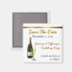 Elegant champagne Save the Date magnet, with a a bottle of champagne, a champagne glass and a gold tone ribbon at the top. Customise the text to anything you want to make it personally yours.