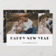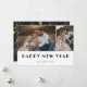 Modern black and gold photo Happy New Year card featuring two photos with a modern font type on the front and a New Year pattern with fireworks, holly and berries, champagne bottles and glasses at the back. Easily personalise this photo holiday card with your photos and the family name.