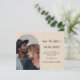 On front: Add your own vertical size photo inside the arch photo frame. A trendy champagne colored background, black text. Templates for names and the date. The name and the text: Save the Date are written with a modern hand lettered style script with a heart.