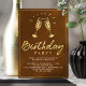 Dark orange and gold birthday party invitations featuring two champagne glasses toasting and "birthday" in a brush script font. "Birthday party" text and the champagne glasses will appear in real metallic foil, while the event details are written in matte white text to be easily readable. Simple and fun adult birthday party invitations that can be changed to any age. Cheers!