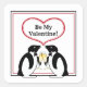 This delightful design features two dapper penguins, with champagne. At the top, a heart and the words, "Be My Valentine".
