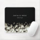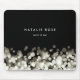 Chic personalized mousepad displays your name, business name or choice of custom text on a black background with a bottom border of luminous bokeh lights in shades of white and champagne