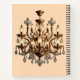 This striking image showcases an iconic chandelier, its intricate crystals and radiant lights meticulously detailed in fine lines. Bathed in golden hues, the chandelier embodies luxury and sophistication, creating a mesmerising interplay of light and shadow against a soft, light-coloured background.