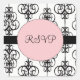 Chandelier Pink Square RSVP Wedding Envelope Seals - black and white chandelier wedding theme on front with a thick black line through the centre. Over top the thick line is a dotted line circle that's shade in baby pink. You can change the font type, sizing, colour or even rearrange text boxes to your personal tastes by clicking the orange customise button below the wedding RSVP sticker demo above. If you are satisfied with the text style, colour and sizing, you may use the personalise feature to the right of the demo to personalise the wording to your wedding details or leave it be. Do you love the design? Scroll down to find matching RSVP cards, save the dates, wedding invitations and more.