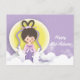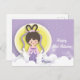 Mid Autumn Festival design with a papercut look with the Lady on the Moon, Chang’e, rabbits, and the full moon on a purple background.