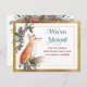 Cute watercolor fox with festive floral holiday berries announcing that you have a new address. Typography style We've Moved text in elegant font style. Faux gold foil border.