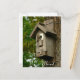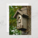 Cute photo of a bird standing outside it's bird house. We've moved in white text on the bottom of the post card. Customise all the text front and back to suit your needs.