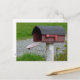 This is a cute country style way of letting folks know you have moved to the country and have a new home mailing address! Colour photo of a plastic mailbox shaped to look like an old red country barn with a black roof. It sits on a weathered white wooden post in tall weeds and the door is hanging open waiting for mail.