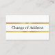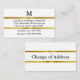 Do you need to make a moving announcement? This enclosure card is white and faux (not foil) gold with black text and you can customise the text with your monogram, name, and new address. At the top, there's a letter you can change to your monogram. On the back, there's custom black text that you can edit if desired (shown:'Change of Address'). Of course, there's also text on a white background for your name, phone number(s), and new address.