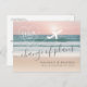 Beautiful beach themed "change of plans" Postponement Notification Postcard to let your guests know that your beach destination wedding location or date (or both) has to be rescheduled or changed for any reason at all. The beautiful beach sunset features pretty turquoise ocean waves and rose gold pink sand, and our unique travel theme aeroplane monogram logo has the couple's initials inside, using fun and modern script font typography. Visit the Paper Grape Destinations Zazzle Designer Shop for more travel and beach theme wedding invitation, save the dates, and postponement announcements.
