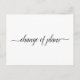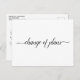 This simple postcard is an elegant and sophisticated way to let your guests know if you are in the unfortunate position of having to alter or postpone your wedding plans. The front reads "change of plans" in elegant script calligraphy, and the back has space for a custom note where you can explain the situation to your guests.