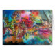 Original Graphic Design by Alessandro Lumini Colourful and expressive watercolor painting 1988 .Knights jousting on horseback in bright blue green,pink,fuchsia,purple,orange yellow,white, brown colours.