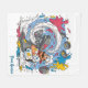 A bold, humorous cartoon illustration featuring a frantic chef with a large mustache, wearing a classic white toque and uniform splattered with bright primary colors. He struggles to control an oversized gray stand mixer as an explosive burst of white batter or frosting erupts violently from the bowl. Vivid splashes of magenta, cyan, and yellow paint fly across a light blue background, while overturned mixing bowls float mid-air, amplifying the sense of chaos. Rendered in a graphic, high-contrast style with thick black outlines, this energetic artwork captures culinary mayhem with playful, comedic flair.