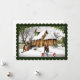 A "Happy Christmas" greeting. Mistletoe trimmed antique greeting card art. A group of villagers walking through the snow to church. European style church with Tudor style trim.