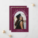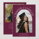 Modern and whimsical graduation announcement photo card featuring an arched frame photo on the front and 1 on the back. The text says "Chapter Complete" with hand drawn stars. Add the graduate's name, information, and message to personalise this card. Cranberry background.
