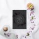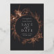 An elegant save the date design featuring your wedding details in chic off-white lettering, encircled by a floral border of rose gold foil lilies and foliage on a deep charcoal black background.