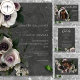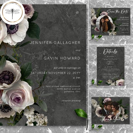 This exquisite wedding invitation design features a captivating spray of pale lavender, white, green, and pale pink anemones and roses, artfully arranged against a luxurious dark charcoal grey background with a soft marbleised effect. The clean, modern white typography adds a touch of elegance, making this invitation the perfect choice for a romantic and sophisticated wedding. Created by Simply Farmhouse Press.