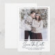 Your couple's photo is showcased on this elegant save the date card. A simple white frame gives it the importance it deserves. Save the date is written in a modern and trendy text. Two lines of text let you personalise your message. Designed to easily embellish any style photograph for any season. Very easy to customise.
