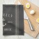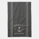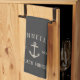 Customise your beach house kitchen with this cute personalised towel featuring your family name or house name and year established in soft tan lettering accented with a nautical anchor illustration on a charcoal grey background.