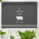Customise your kitchen with this cute personalised towel featuring your family name or house name and year established in soft ivory lettering accented with a bear illustration on a charcoal grey background.