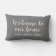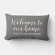 Deep charcoal and white deliver a sleek, modern look on this personalised indoor lumbar pillow featuring Welcome to Our Home in flowing script with your family name. The rich grey tone pairs beautifully with both warm and cool interior palettes. All text is fully editable.