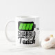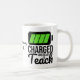 This mug is a perfect gift for a teacher returning to school after a vacation; relaxed, rested and recharged. The design features a fully charged black battery with green charge lines and black writing with the words 'Charged And Ready To Teach' on a white mug. This mug can be personalised by changing the name and grade on it.