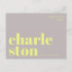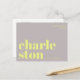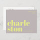 Send a stylish and contemporary greeting from Charleston South Carolina with this modern typographic postcard. Featuring the word Charleston split across two lines in bold, decorative lowercase letters in bright yellow on a soft grey background, this design is both minimalist and eye-catching. The phrase "greetings from" appears above in a sleek, thin sans serif font, adding a modern, elegant touch. Perfect as a travel keepsake, a decorative piece, or a unique way to send love from your favourite city. Ideal for fans of contemporary design, typography, and wanderlust.
