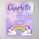 Purple Charlotte Name Poster with rainbow, unicorns and customisable text. The adjectives start with each letter of the chosen name. You can customise the adjectives for this name or choose another name and corresponding adjectives. Or you can contact me to customise a poster with your name of choice. NOTE: when customising, the top name is written twice (once in purple and once with a lighter "shadow") to make it stand out.