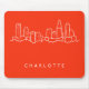 This design features a hand drawn sketch of the Charlotte skyline on a purple background.