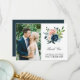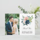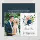 This custom wedding thank you card includes a photo template for uploading your favourite wedding photo. Embellished with a watercolor bouquet of pink and indigo blue flowers with trailing greenery, this card is part of a matching wedding suite with invitations and other wedding stationery and products. A sample note is included on the reverse side of this elegant flat card that you can edit with your own personal message. Replace the sample wedding photo with your vertical photo.