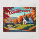A picturesque fall scene in Connecticut featuring a classic white church, covered bridge, and vibrant foliage — perfect for seasonal gifts and heartfelt mail.