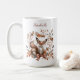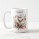 Charming autumnal woodland scene, featuring a central figure of a fox surrounded by nature-inspired elements. The fox has a cute, almost cartoon-like appearance with a soft, bushy tail, and next to it is a smaller fox. Surrounding them are decorative branches with acorns, berries, leaves in shades of orange and brown, and a bird perched on a branch. A large bow tied at the bottom of the image enhances the whimsical feel, completing the rustic autumn aesthetic. This mug makes a beautiful gift for girls, mother, teacher. Personalise this beautiful mug to be unique with your name.