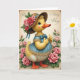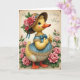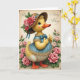 This card features a friendly, humanlike little bird centered on the front, with soft yellow feathers, bright blue eyes, and an orange beak and webbed feet. It wears a wide brown hat trimmed with pink and red roses and green leaves, held with a flowing blue ribbon, and the bird’s gentle blush and tender, welcoming gaze suggest closeness like a sweet friendship. A ruffled blue dress with golden trim frames its small shape, and a neat blue bow at the neck ties the look together while one wing gives a cheerful thumbs-up. Around the character, an arch of blooming pink roses and leafy greenery creates a garden setting that feels like a spring hello 🌷. The background is a creamy antique beige with faint decorative curls in the upper corners, giving the layout an old-fashioned touch. Any greeting text sits near the top in thin, flowing lettering, colored a soft blue that matches the ribbon and dress 🐰. The roses range from pale blush to deeper pink, with layered petals and scattered green leaves curving along the border.