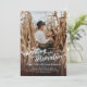 A photo wedding invitation with the invitation text written atop a photo of your choosing. Wedding celebration is written in a white brush script decorated with small leaves for a rustic enchanting look. Add your names and wedding details too.
