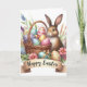 Charming Easter-themed illustration with a bunny seated next to wicker basket overflowing with colourful Easter eggs. Surrounding the basket are vibrant spring flowers, including pink, purple, and yellow blooms, as well as stalks of wheat and leafy greens, evoking the season's natural beauty. A beige ribbon at the bottom, with the text "Happy Easter" written in an elegant, bold script, completes the festive message.
