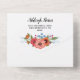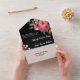 Charming floral all in one wedding invitation in black with white fonts and colourful flower arrangements in coral, peach, orange, and hot pink with greenery and berries. The other side of the invitation, which will feature as an envelope, is white with another beautiful flower arrangement beneath the return address.