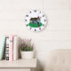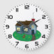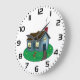 Cartoon Cottage Wall Clock - Home Sweet Home Decor. Keep track of time with this cheerful wall clock featuring the adorable blue house illustration. The clock face prominently displays the whimsical design of the cottage, complete with the happy dog in the garden and the cat in the window. This functional piece of artwork is perfect for adding charm to a kitchen, nursery, living room, or home office. The unique residential graphic makes a wonderful housewarming gift or a charming addition to any pet lover's home decor.