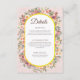 Charming Garden Floral Wedding Details Card featuring a soft pink background with elegant yellow-bordered floral accents. Perfect for sharing important wedding information such as reception, accommodation, and additional details with your guests. Customise easily to match your wedding theme.