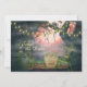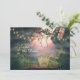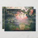 This Save the Date wedding announcement features a charmingly spooky graveyard. There are a few old grave stones with a background of twisted trees decorated with charming flower lights and a beautiful dark pinkish sky.