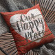 Simply cute motivational and inspirational Our Happy Place quote text in dark grey elegant calligraphy script, on a cute whimsical white heart motif on a red coloured faux weathered farmhouse wood grain texture background.