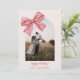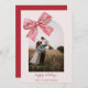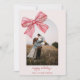 A cute holiday card your favourite photo in an arch shape embellished with a watercolor red candy striped bow and editable handwriting style red type, all on a light blush pink background.