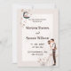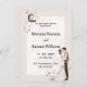 Romantic wedding invitation featuring a charming illustration of the bride and groom.The background is soft beige with delicate leaves.The design is beautiful and elegant, perfect for a romantic wedding.
