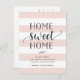 Charming and modern moving announcements let friends and family know about your new home sweet home! Design features a subtle striped background in blush pink and white, with "home sweet home" in soft black script and block typography. Use the template fields to add your custom intro, new address and names. Information repeats on the reverse side with space for recipient addressing.