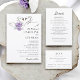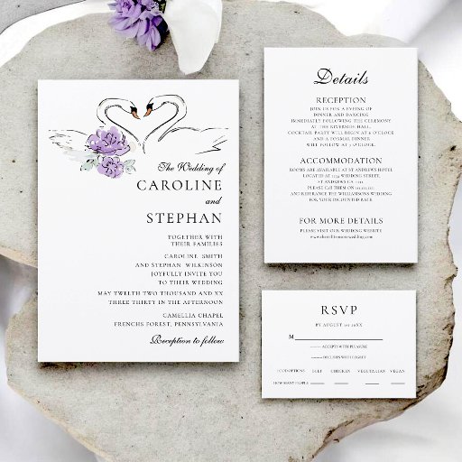 Mark the beginning of your forever with these charming wedding invitations, beautifully illustrated with a pair of watercolor swans forming a sweet heart shape. Complementing the swans are lovely sprigs of purple flowers, adding a touch of gentle color and sophistication. This design is perfect for couples desiring a romantic and artistic announcement for their wedding day. The delicate watercolor style and heartwarming imagery will create an unforgettable impression as you invite loved ones to share in your joy.